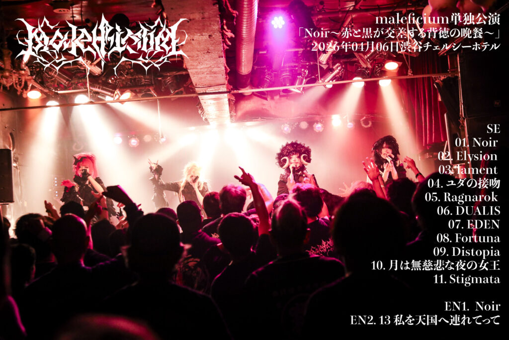最後にmaleficiumは、全身に熱を帯びた観客たちを甘美な宴へと連れ出し、ともに戯れようと、黒い翼を大きくはためかせながら『私を天国へ連れてって』を歌い、観客たちを熱狂と恍惚の舞台へと連れ出した。エモくてメロい歌を魅力にしたインダストリアルでゴシックな楽曲の上で、麗しき堕天使となった彼女たちが、ここにいる人たちを、天国という名の奈落へ落としていった。彼女たちが黒い翼を羽ばたかせて連れ出した、その先に、あたはどんな景色を見ていただろうか…。それは空虚な世界?それとも、光り輝き、黒い花咲く希望の世界?その答えを探しに、またmaleficiumのライブに足を運ぼうか。