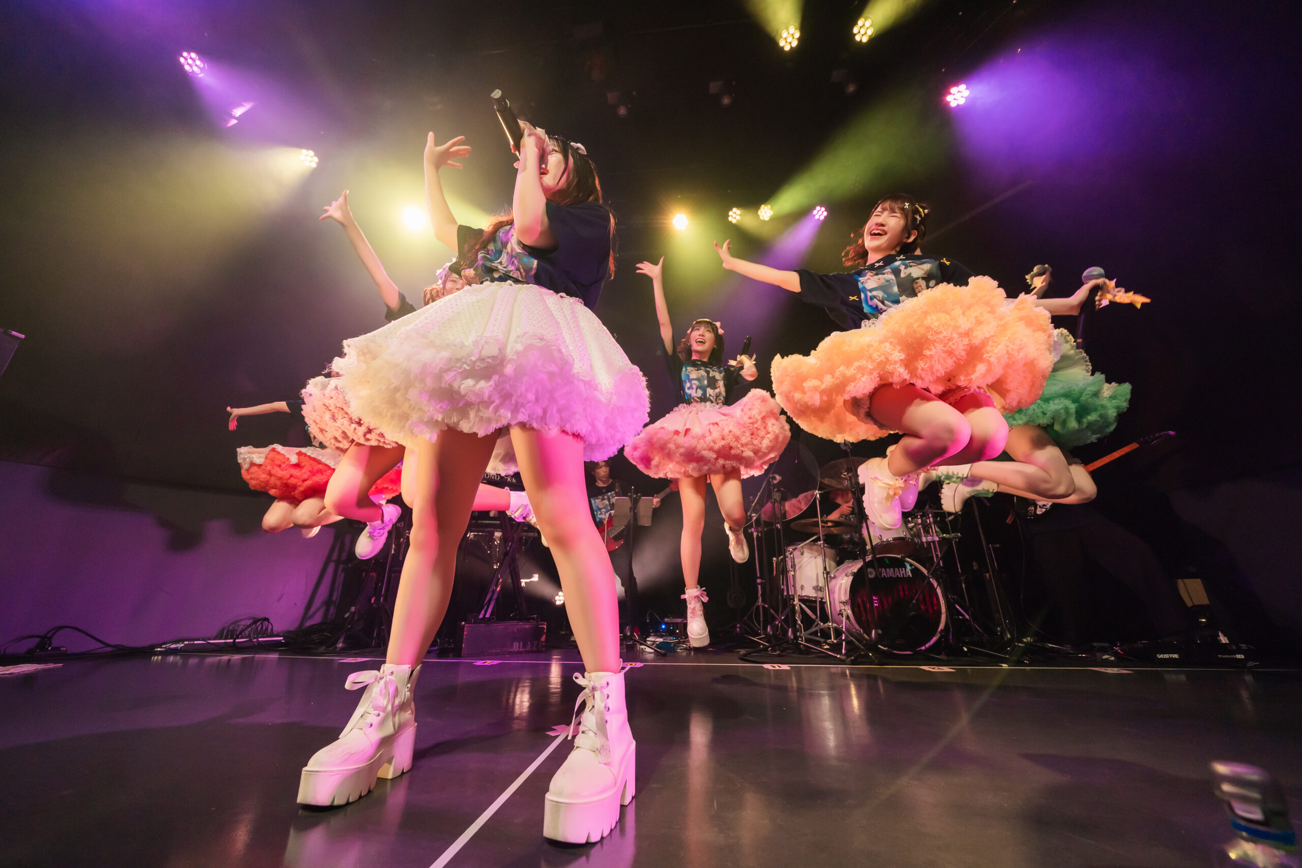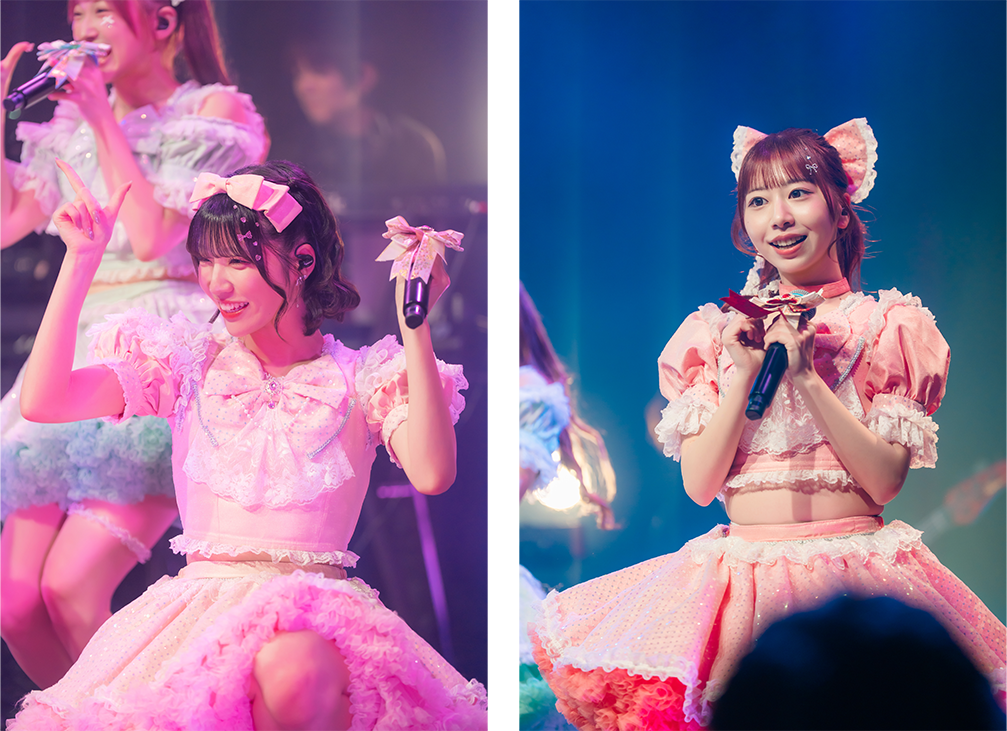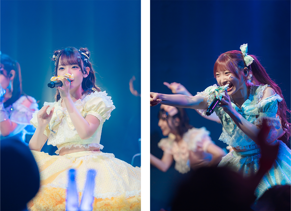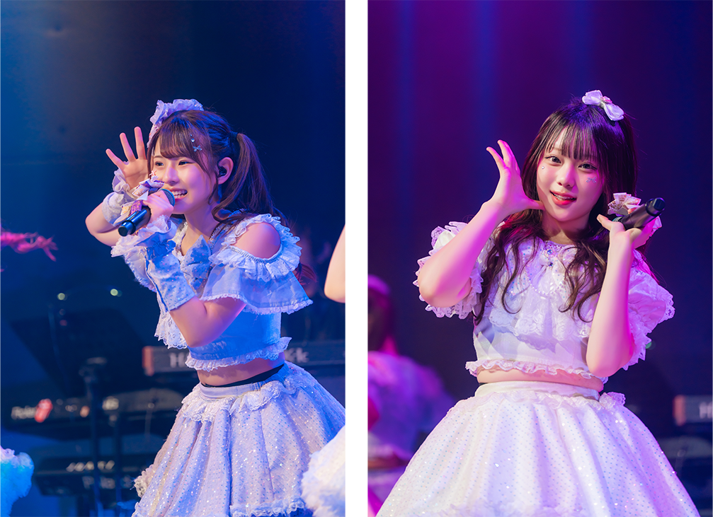 I’Rinkに新たな歴史が刻まれたこのタイミングで、前身グループ「iSPY」のデビュー曲である「STAGE!!」の演奏が開始。続けて「サインボールを投げちゃいますよ!」の一言とともに始まったのは「夏色ラムネ」。サビのたびに2人が前に出てボールをフロアへ投げ込む、ワンマンらしい演出で会場を盛り上げた。